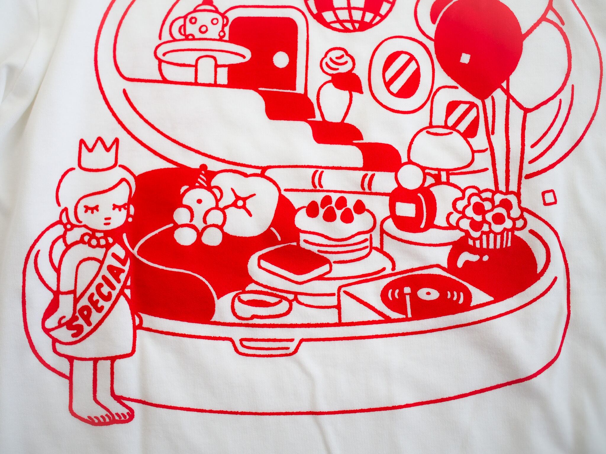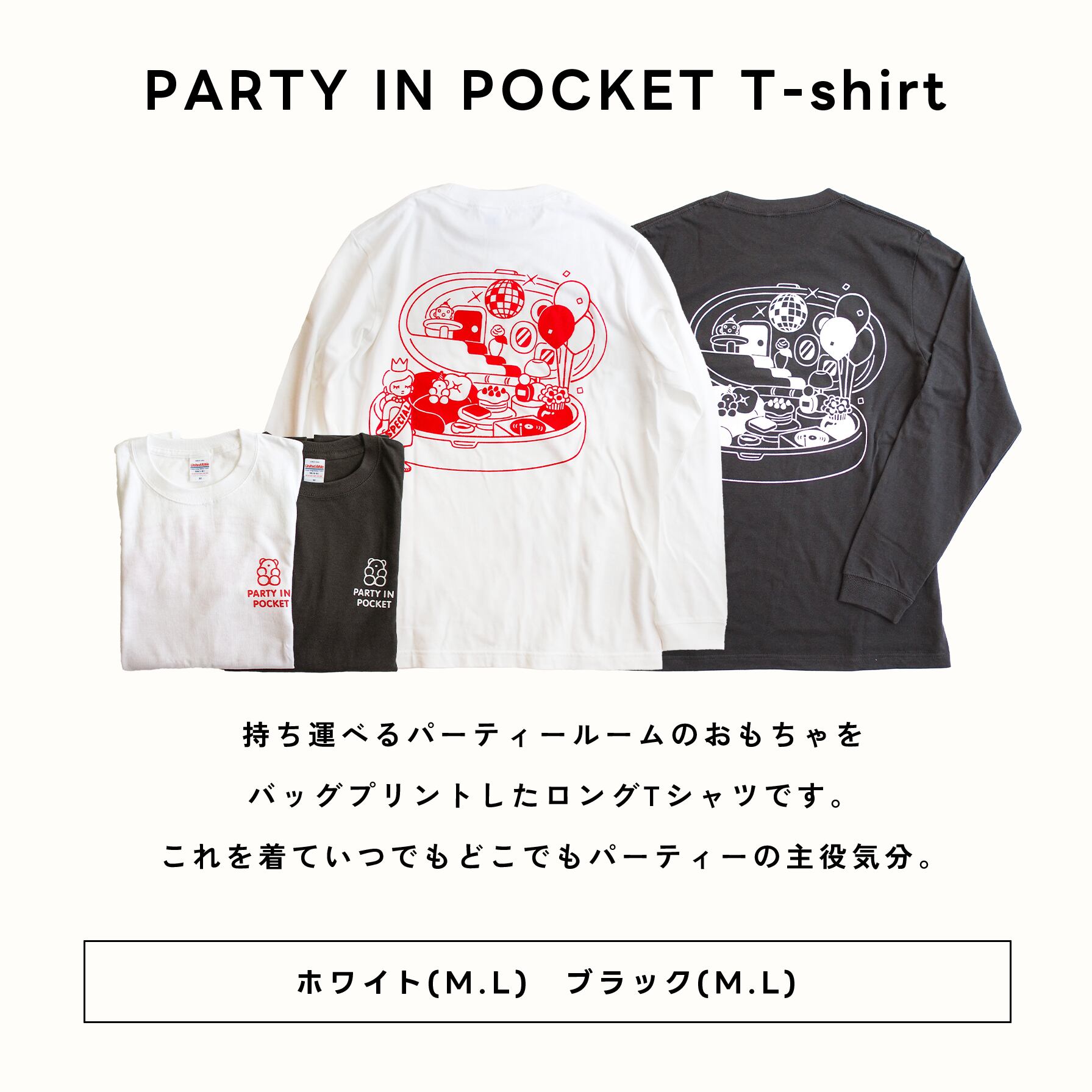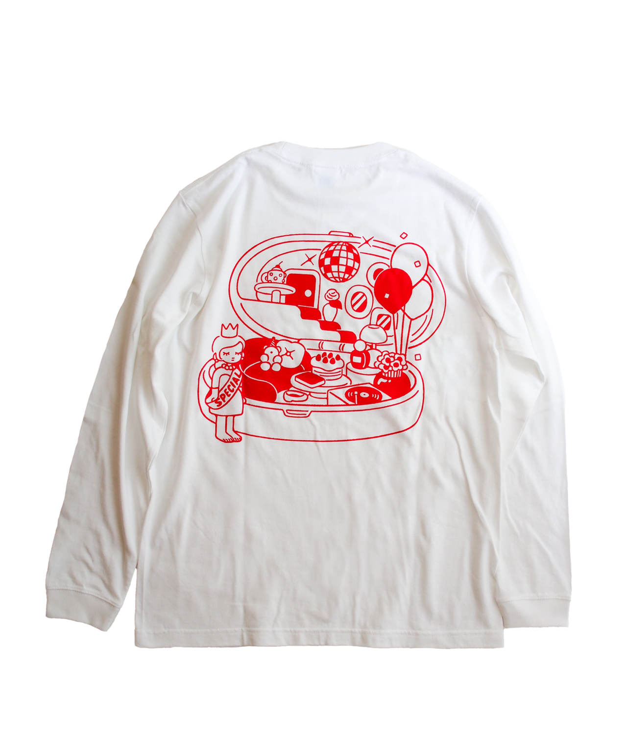 持ち運べるパーティールームのおもちゃをバッグプリントしたロングTシャツです。